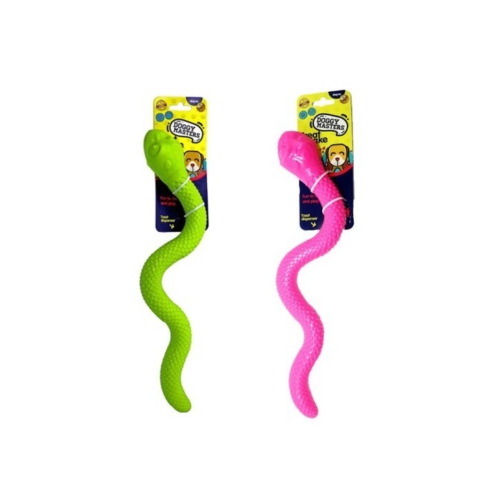 Juguete para perros en forma de serpiente. Muy resistente y disponible en colores verde y rosa.