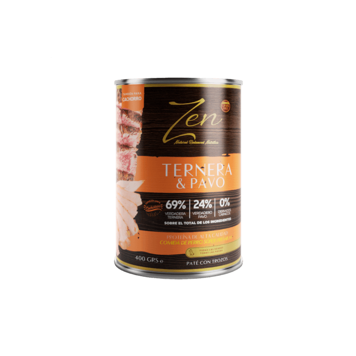 Paté con tozos de ternera y pavo. 69% ternera, 24% verdadero pavo, 0% derivados cárnicos. Además está libre de cereales (Grain Free) y es apto para perros adultos de todas las razas y también para cachorros. El envase contiene 400 g.
