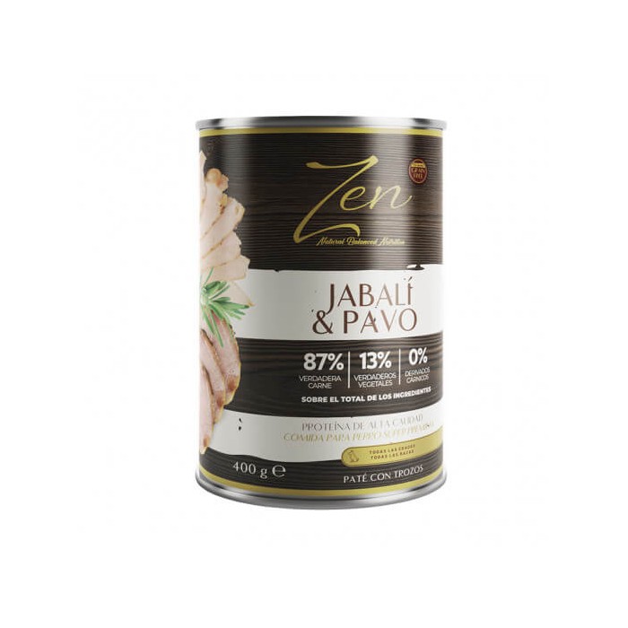 Comida húmeda complementaria super premium para perros. Paté con trozos de jabalí y pavo. Sin gluten. Proteína de alta calidad. 100% libre de manipulación genética. Apto para todas las edades y razas. 87% verdadera carne. 13% verdaderos vegetales. El envase contiene 400 g.