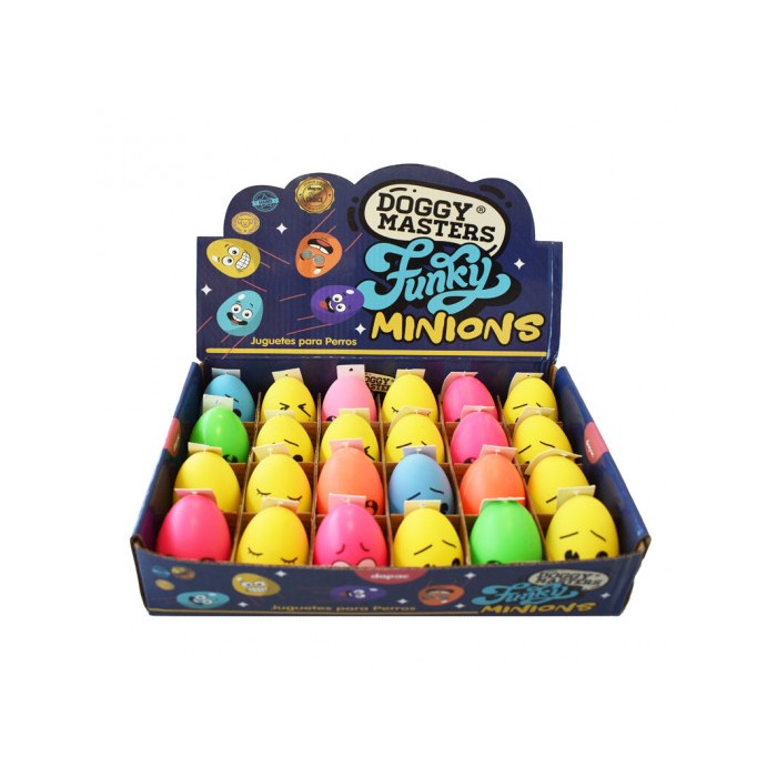 Juguete para perros Funky Minions. Varios colores y caritas diferentes. Textura suave. Resistente. Dimensiones caja: 27x18 cm. El display contiene 24 unidades. Dimensiones juguete: 6.5 x 4 X 3 cm .